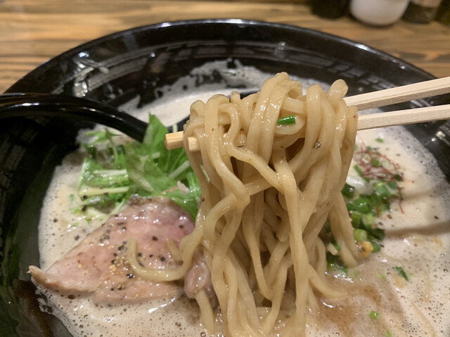 麺もスープのパンチに負けないな、全粒粉を使用したもっちり麺。